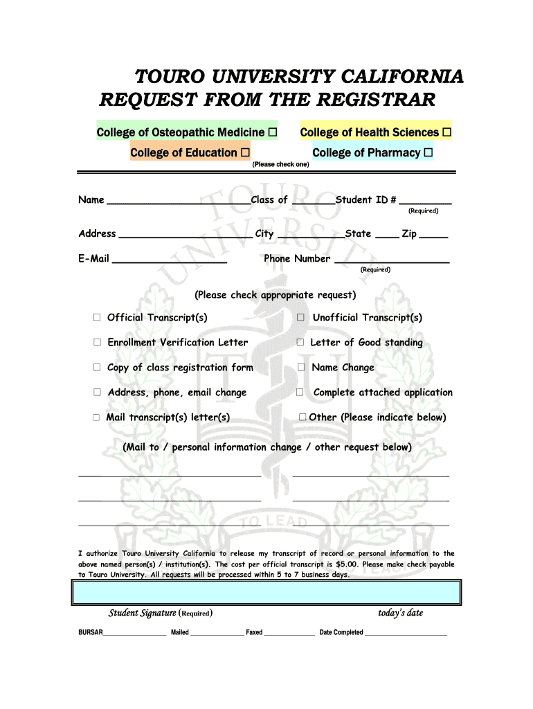 Get the free TOURO UNIVERSITY CALIFORNIA REQUEST FROM THE REGISTRAR - tws tu