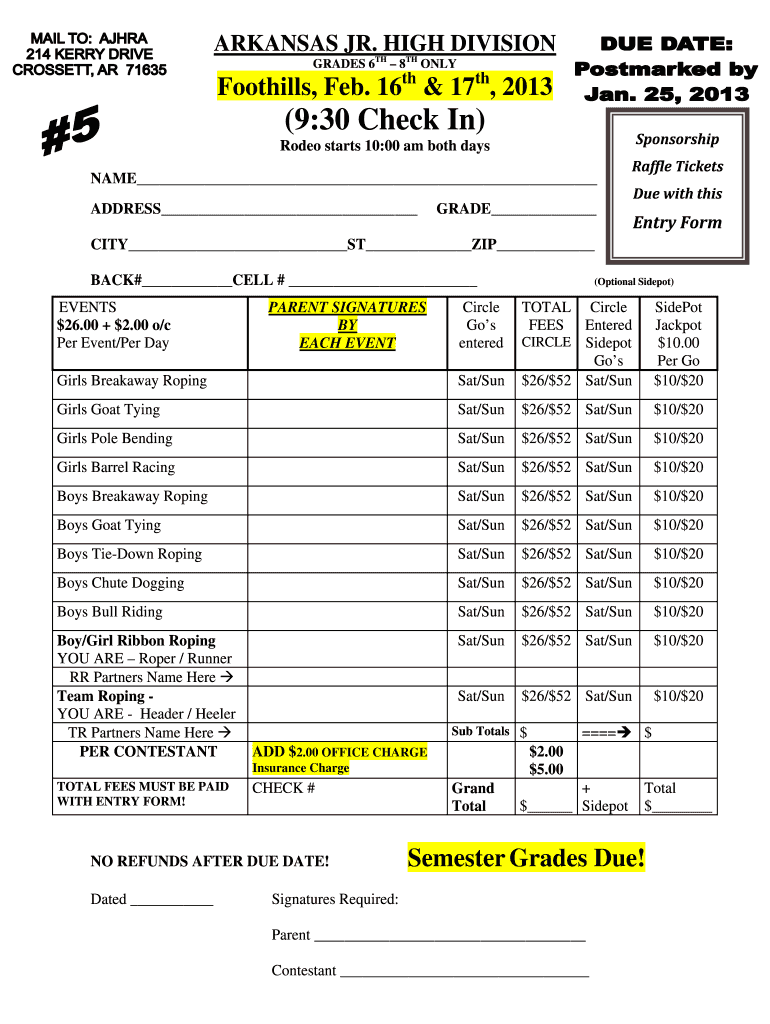 ARKANSAS JR. HIGH DIVISION GRADES 6TH 8TH ONLY Foothills, Feb. 16th & 17th, 2013 ×9:30 Check In) Sponsorship Rodeo starts 10:00 am both days NAME ADDRESS Raffle Tickets GRADE Due with this Entry