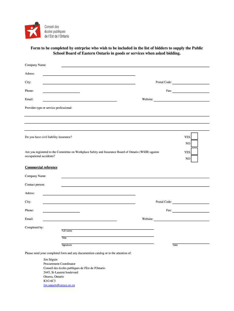 Send by Email Reset Print Form to be completed by enterprise who wish to be included in the list of bidders to supply the Public School Board of Eastern Ontario in goods or services when asked bidding.