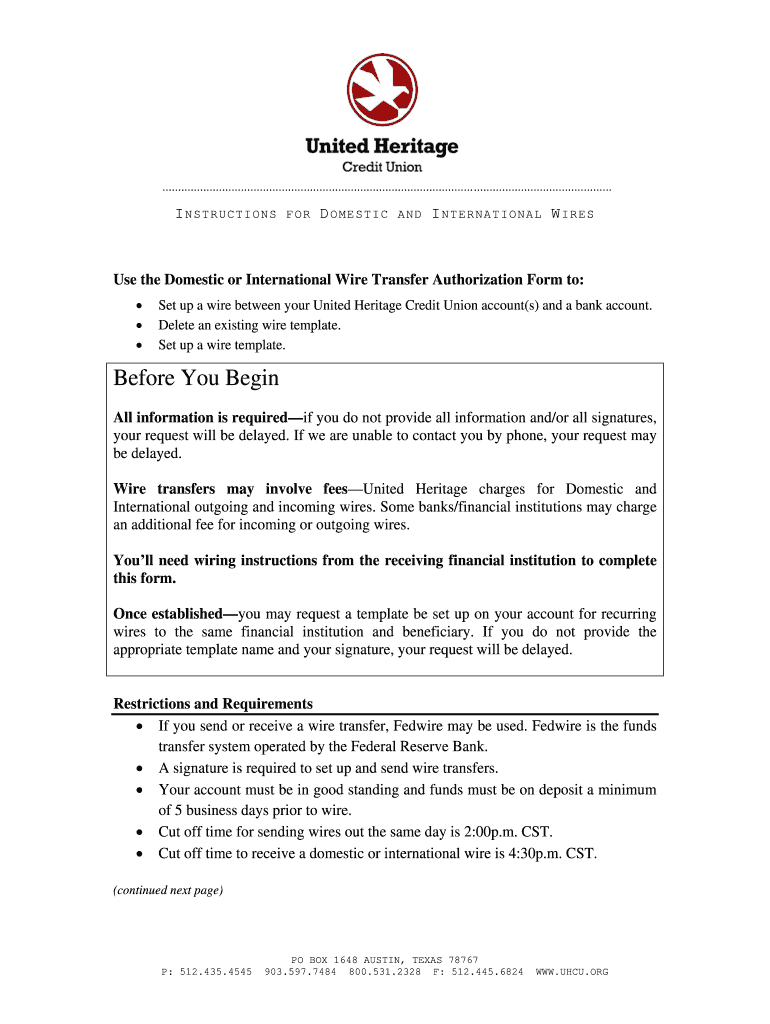 The Domestic Wire Transfer Authorization Form is intended for members of United Heritage Credit Union who wish to initiate or modify wire transfers between their accounts and other financial institutions.