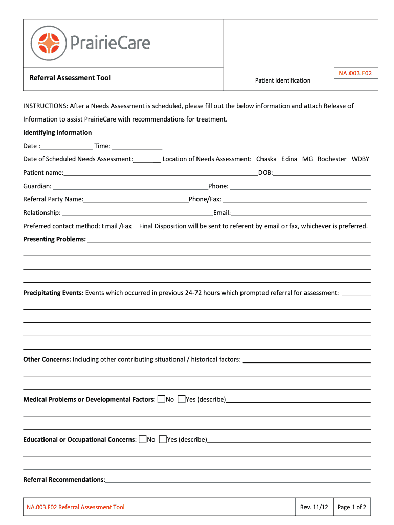 NA.003. F02 Referral Assessment Tool Patient Identification INSTRUCTIONS: After a Needs Assessment is scheduled, please fill out the below information and attach Release of Information to assist Prevailed