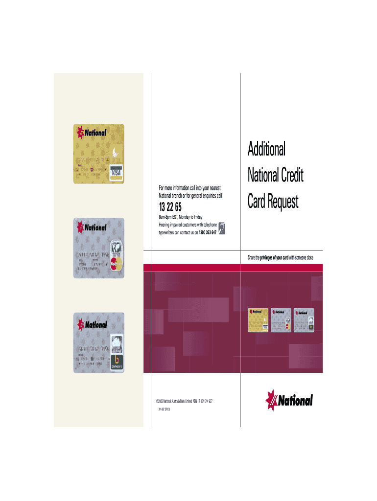 The Additional National Credit Card Request is a financial application used by existing National Australia Bank cardholders to request an additional credit card linked to their account.