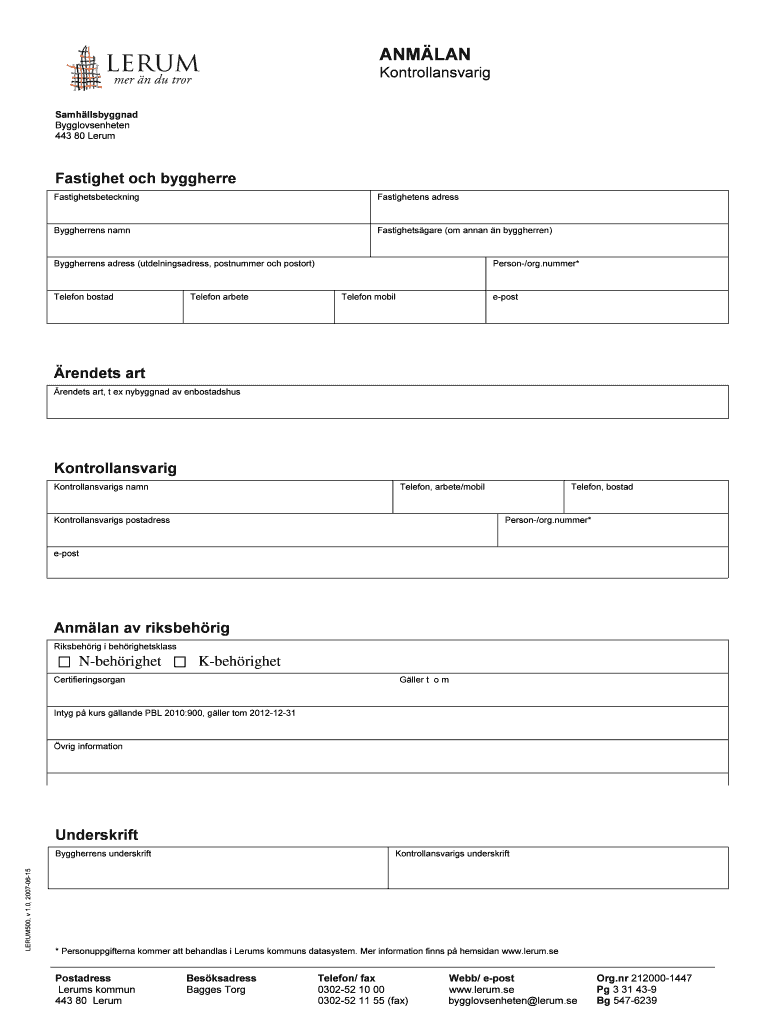 Get the free NY PBL Anm344lan Kontrollansvarigdoc - lerum