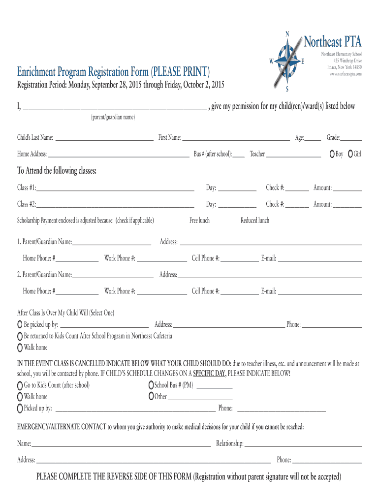 Northeast PTA Northeast Elementary School 425 Winthrop Drive Ithaca, New York 14850 www.northeastpta.com Enrichment Program Registration Form (PLEASE PRINT) Registration Period: Monday, September