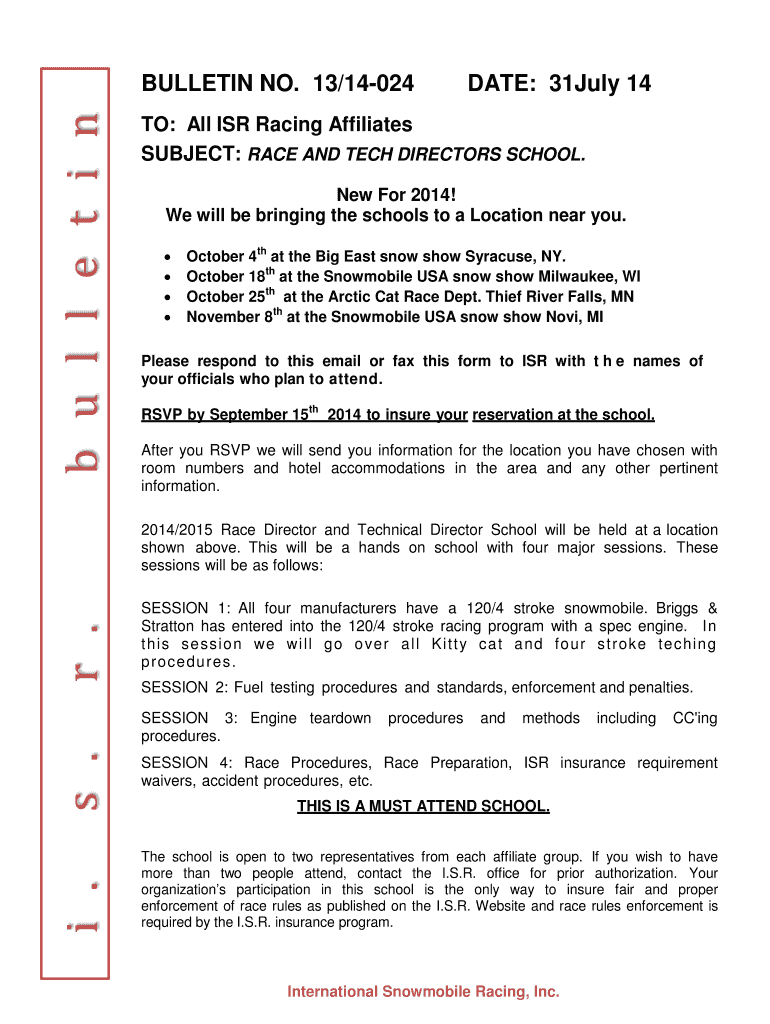B u l l t n BULLETIN NO. 13×14024 DATE: 31July 14 TO: All ISR Racing Affiliates SUBJECT: RACE AND TECH DIRECTORS SCHOOL. New For 2014! We will be bringing the schools to a Location near you. October