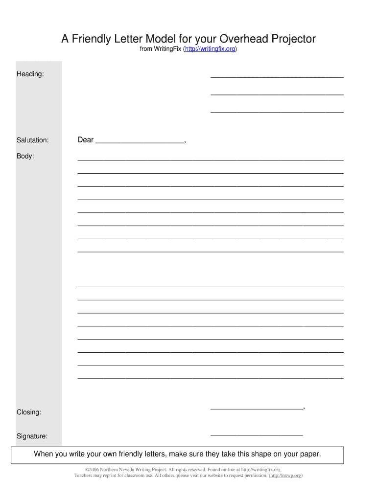 A Friendly Letter Model for your Overhead Projector from Writing (HTTP://writing fix.org×Heading: Salutation:Dear, Body: Closing:Signature:, When you write your own friendly letters, make sure they