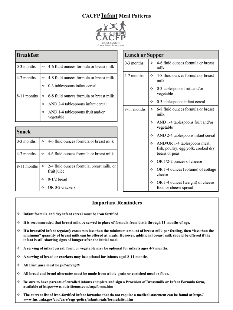 CA CFP Infant Meal PatternsLunch or SupperBreakfast 03 months 46 fluid ounces formula or breast milk47 months 48 fluid ounces formula or breast milk03 months milk 47 months 48 fluid ounces formula