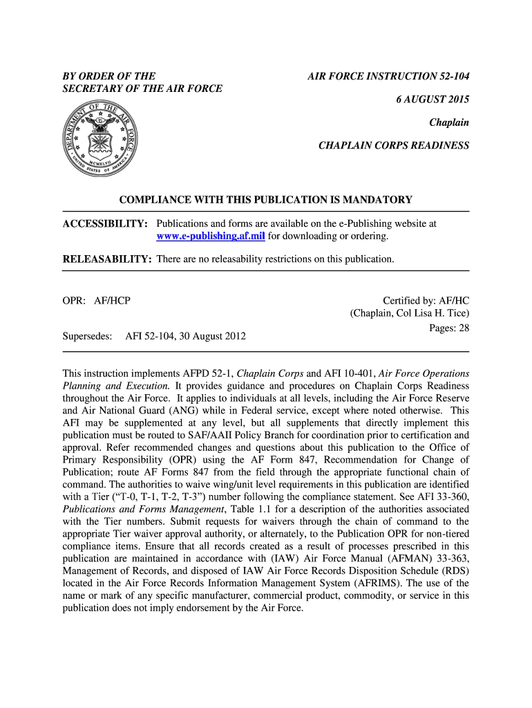 This instruction provides guidance and procedures for Chaplain Corps Readiness throughout the Air Force, applicable to all levels, including the Air Force Reserve and Air National Guard while in Federal