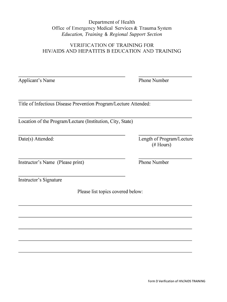 This form is crucial for maintaining the licensing and employment standards of EMS providers, ensuring they are adequately trained to handle situations that may involve HIV/AIDS.