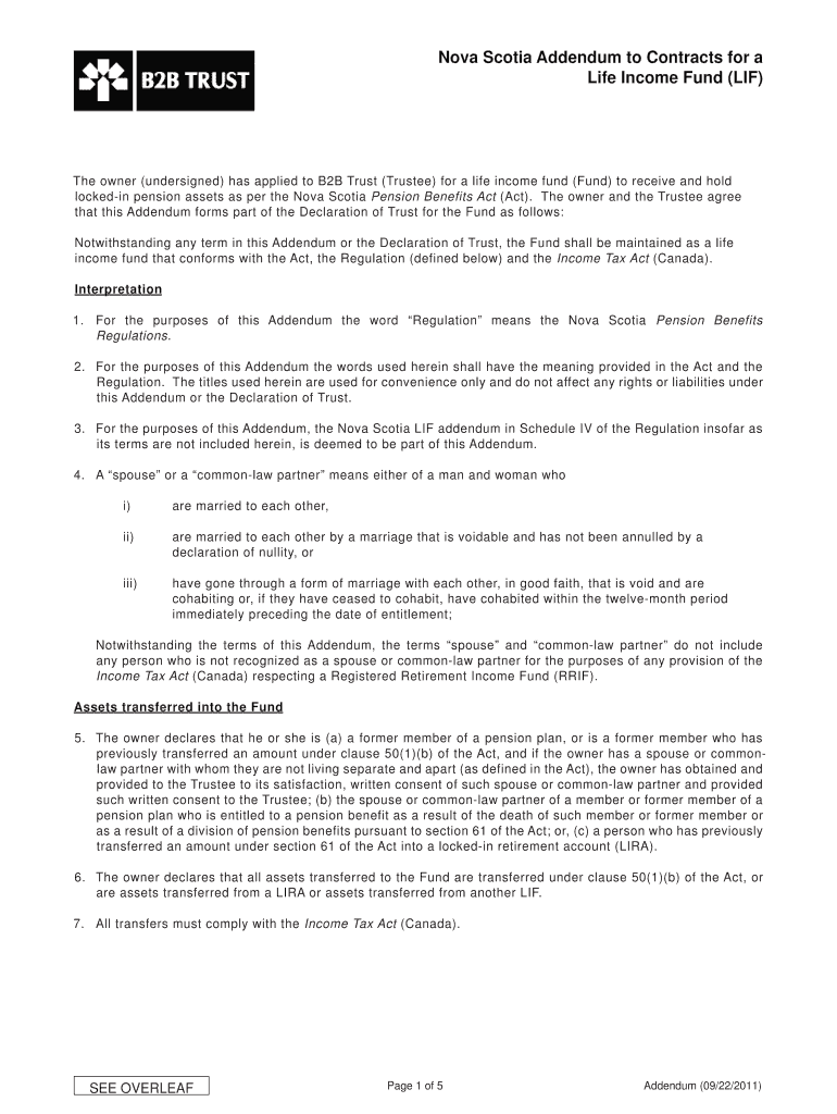 Reset Form Import Data PRINT LETTER SIZE Nova Scotia Addendum to Contracts for a Life Income Fund (IF) The owner (undersigned) has applied to B2B Trust (Trustee) for a life income fund (Fund) to receive