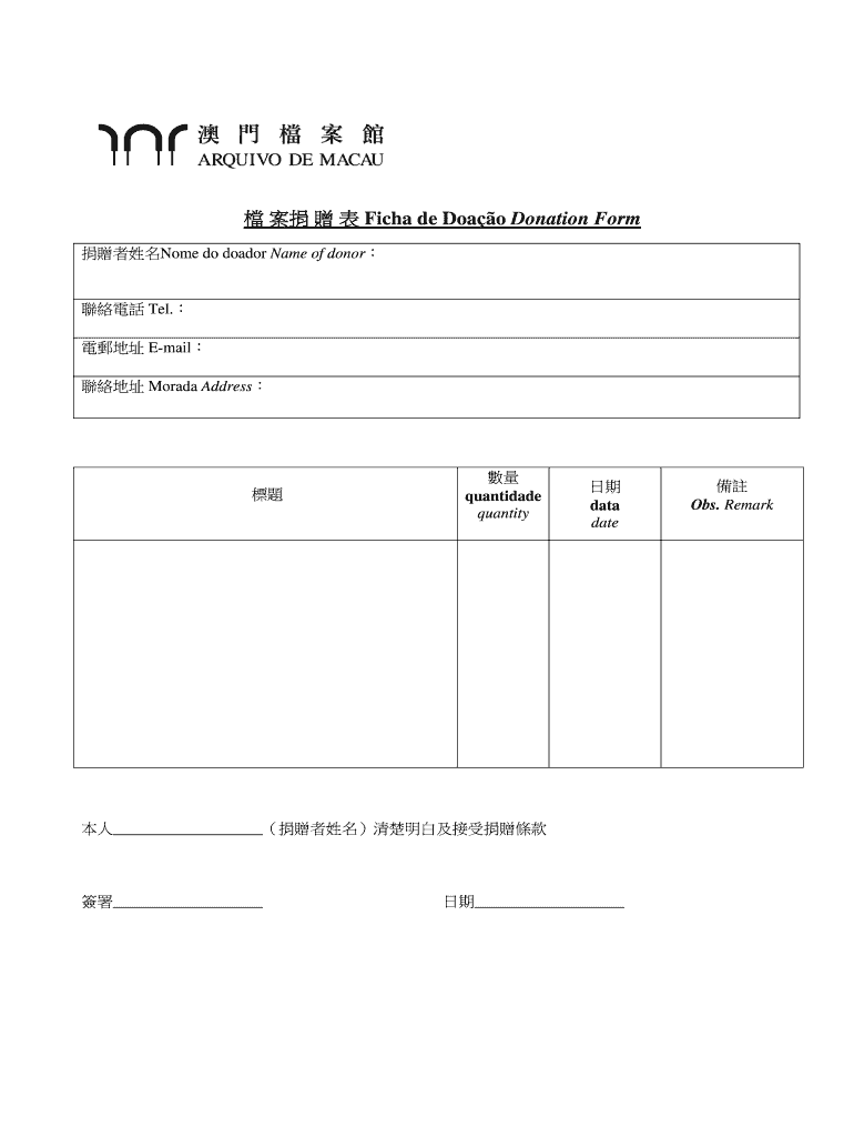 FICA de Doao Donation Form Nome do door Name of donor Tel. Email Moreira Address quantified quantity data date Obs. Remark
