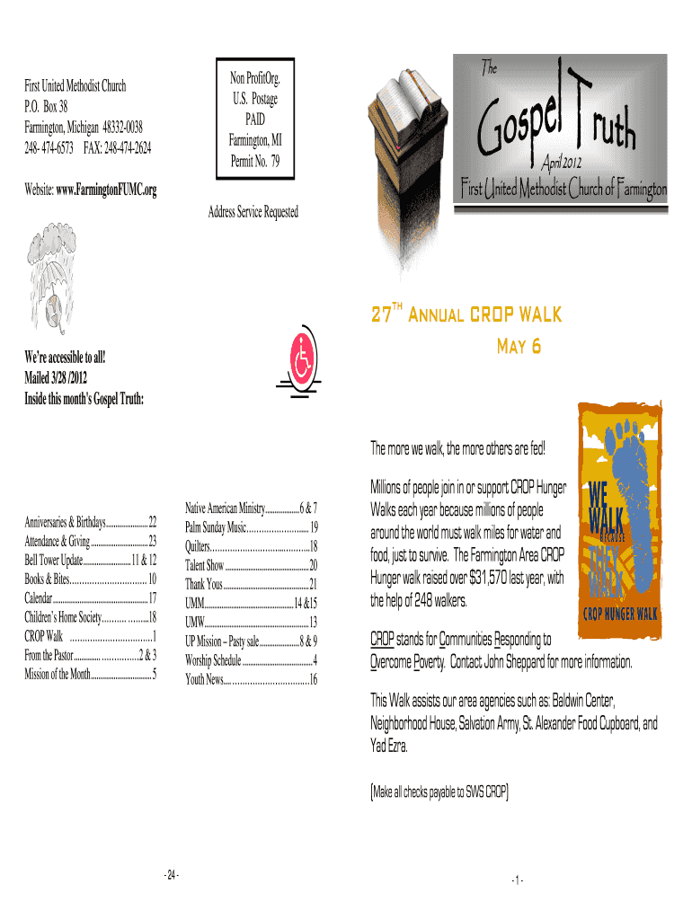 Non Profiting. U.S. Postage PAID Farmington, MI Permit No. 79 First United Methodist Church P.O. Box 38 Farmington, Michigan 483320038 248 4746573 FAX: 2484742624 Website: www.FarmingtonFUMC.org Address