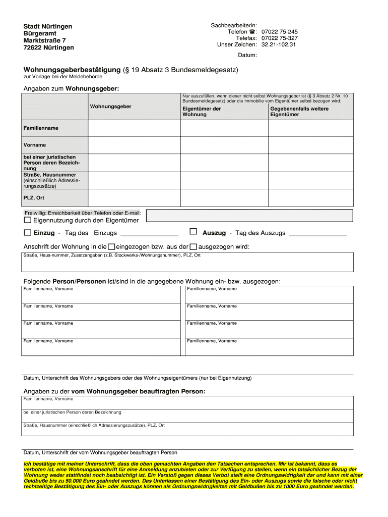 Sachbearbeiterin: Telephone : 07022 75245 Telefaxes: 07022 75327 Under Aachen: 32.21102.31 Start Nitrogen Breast Marktstrae 7 72622 Nitrogen Data: Wohnungsgeberbesttigung (19 Ansatz 3 Bundesmeldegesetz)