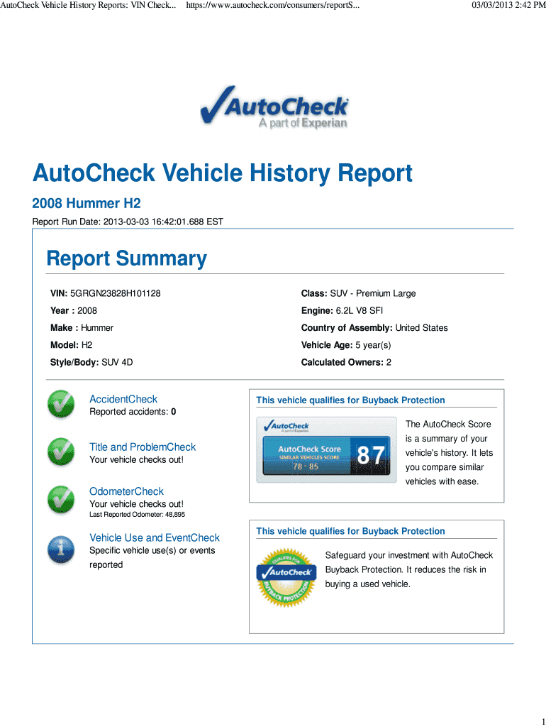 Autocracy Vehicle History Reports: VIN Check...HTTPS://www.autocheck.com×consumers×reports...03×03×2013 2:42 PMAutoCheck Vehicle History Report 2008 Hummer H₂ Report Run Date: 20130303 16:42:01.688