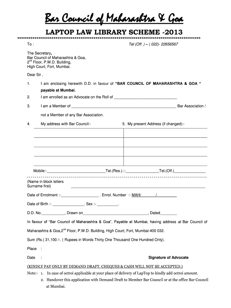 Bar Council of Maharashtra & Goa LAPTOP LAW LIBRARY SCHEME 2013 ************************************************************************************************ Tel (Off. ) (022× 22656567 To : The