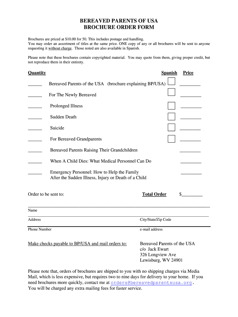 BEREAVED PARENTS OF the USA BROCHURE ORDER FORM Brochures are priced at $10.00 for 50. This includes postage and handling. You may order an assortment of titles at the same price. ONE copy of any