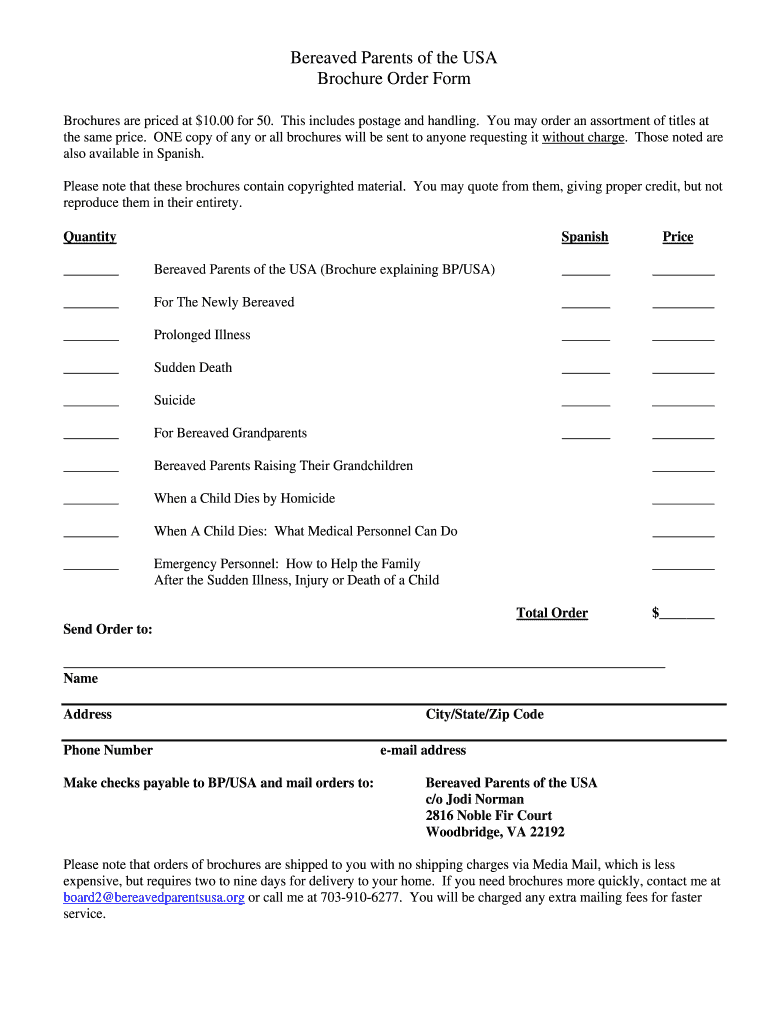 Bereaved Parents of the USA Brochure Order Form Brochures are priced at $10.00 for 50. This includes postage and handling. You may order an assortment of titles at the same price. ONE copy of any