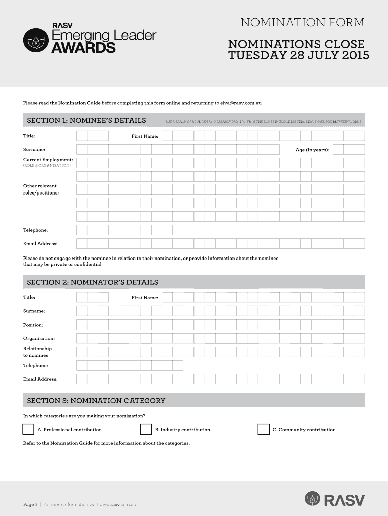 Nomination Form Nominations CLOSE T 28 July 2015 Please read the Nomination Guide before completing this form online and returning to Elva rasv.com.AU SECTION 1: Nominees DETAILS Title: Use a black