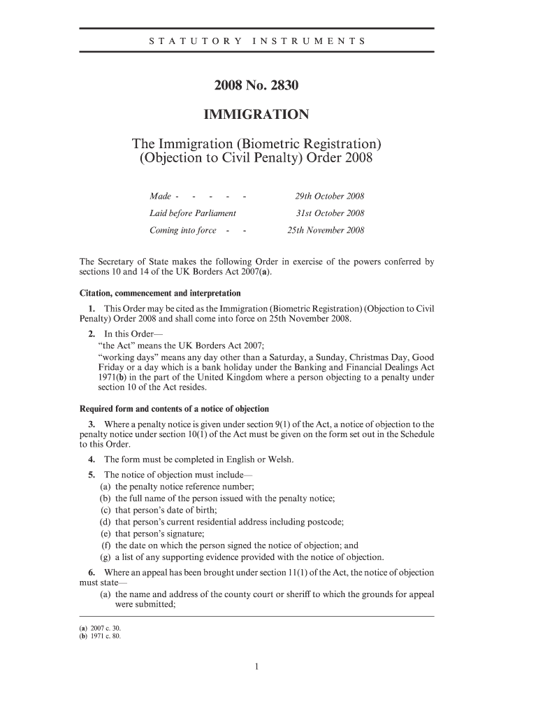 Get the free Immigration (Biometric Registration) (Objection to Civil Penalty) Order 2008 - legis...