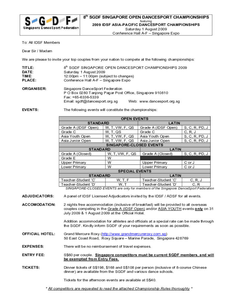 8th SGDF SINGAPORE OPEN ANCESTOR CHAMPIONSHIPS featuring2009 IDF ASIAPACIFIC ANCESTOR CHAMPIONSHIPS Saturday 1 August 2009 Conference Hall AF Singapore Expo To: All IDF Members Dear Sir / Madam We