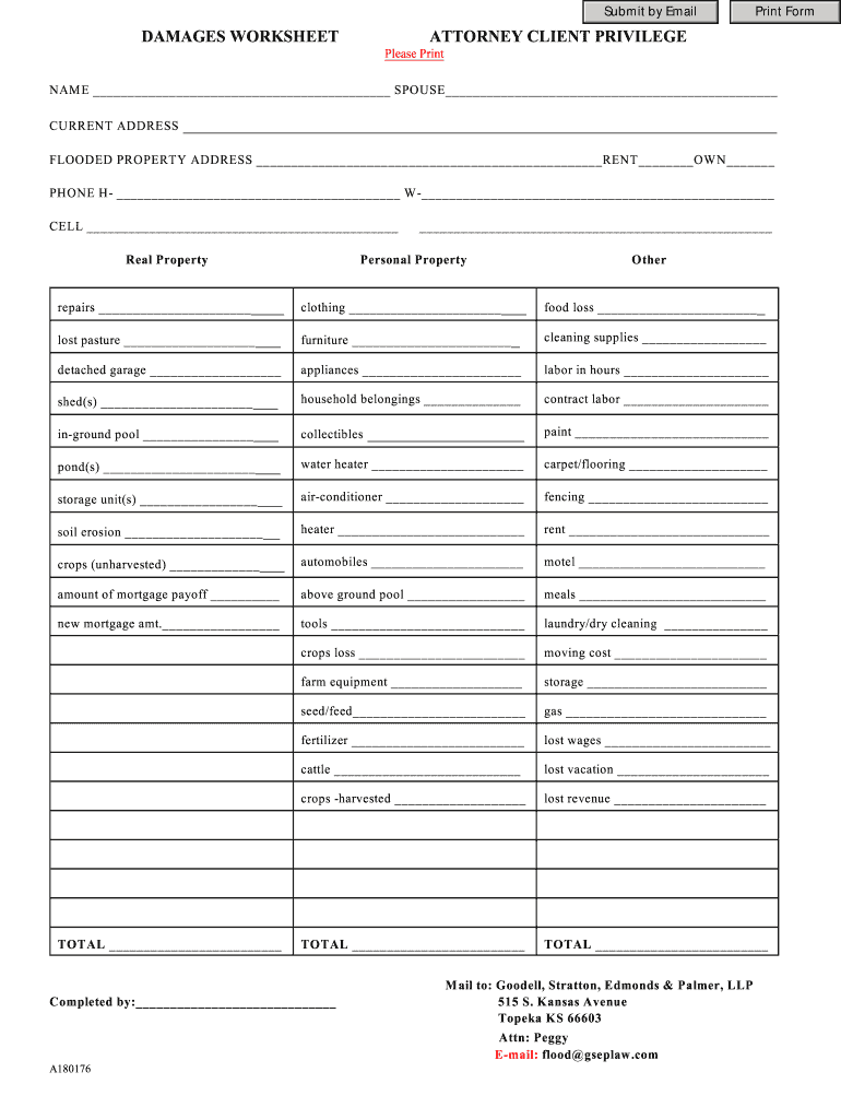 Submit by Email DAMAGES WORKSHEET Print Form ATTORNEY CLIENT PRIVILEGE Please Print NAM E SPOUSE CURRENT ADDRESS FLOODED PROPERTY ADDRESS RENT OW N PHONE H W CELL Real Property Personal Property Other