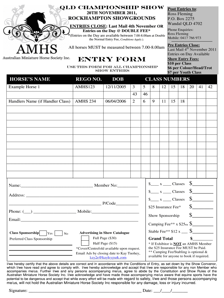 QLD Championship SHOW Post Entries to: 20TH NOVEMBER 2011, ROCKHAMPTON SHOWGROUNDS ENTRIES CLOSE: Last Mail 4th November OR Ross Fleming P.O. Box 2275 Wanda QLD 4702 Phone Inquiries: *(Entries on