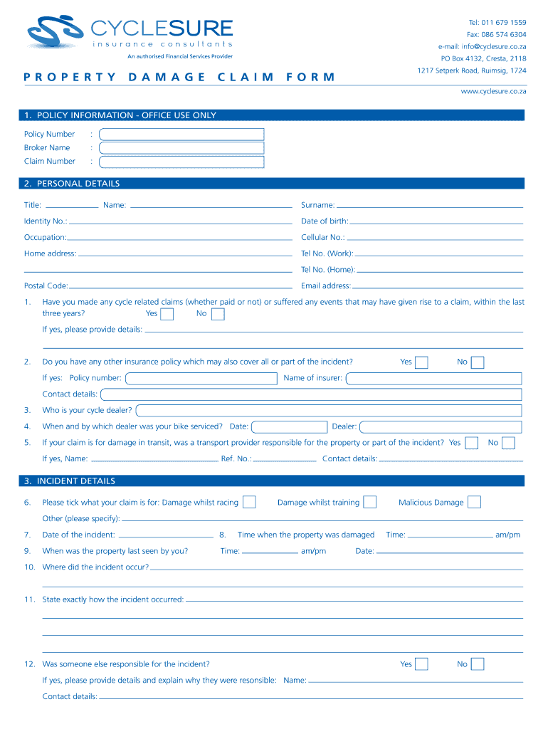 Tel: 011 679 1559 Fax: 086 574 6304 insurance consultants email: info cycle sure.co.ZA An authorized Financial Services Provider P R O P E RT Y DA M AG E PO Box 4132, Crest, 2118 CLAIM M 1217 Set