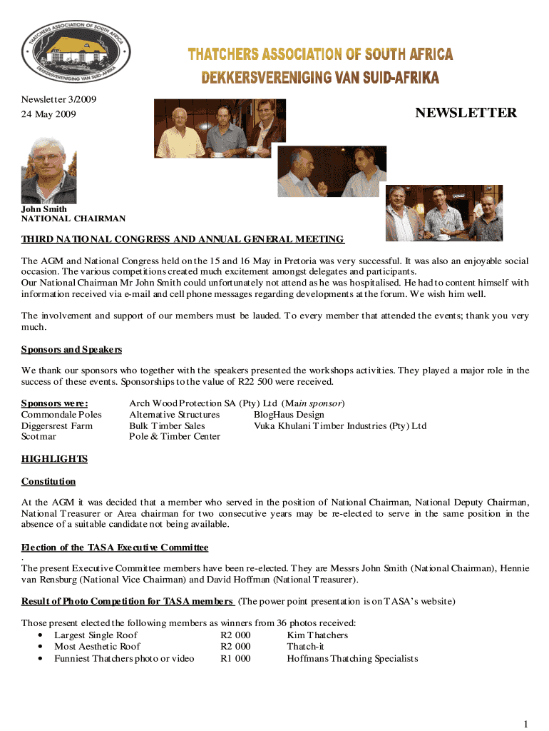 Newsletter 3×2009 NEWSLETTER 24 May 2009 John Smith NATIONAL CHAIRMAN THIRD NATION NAL CONGRESS AND ANNUAL GENERAL MEETING The AGM and National Congress held on the 15 and 16 May in Pretoria was