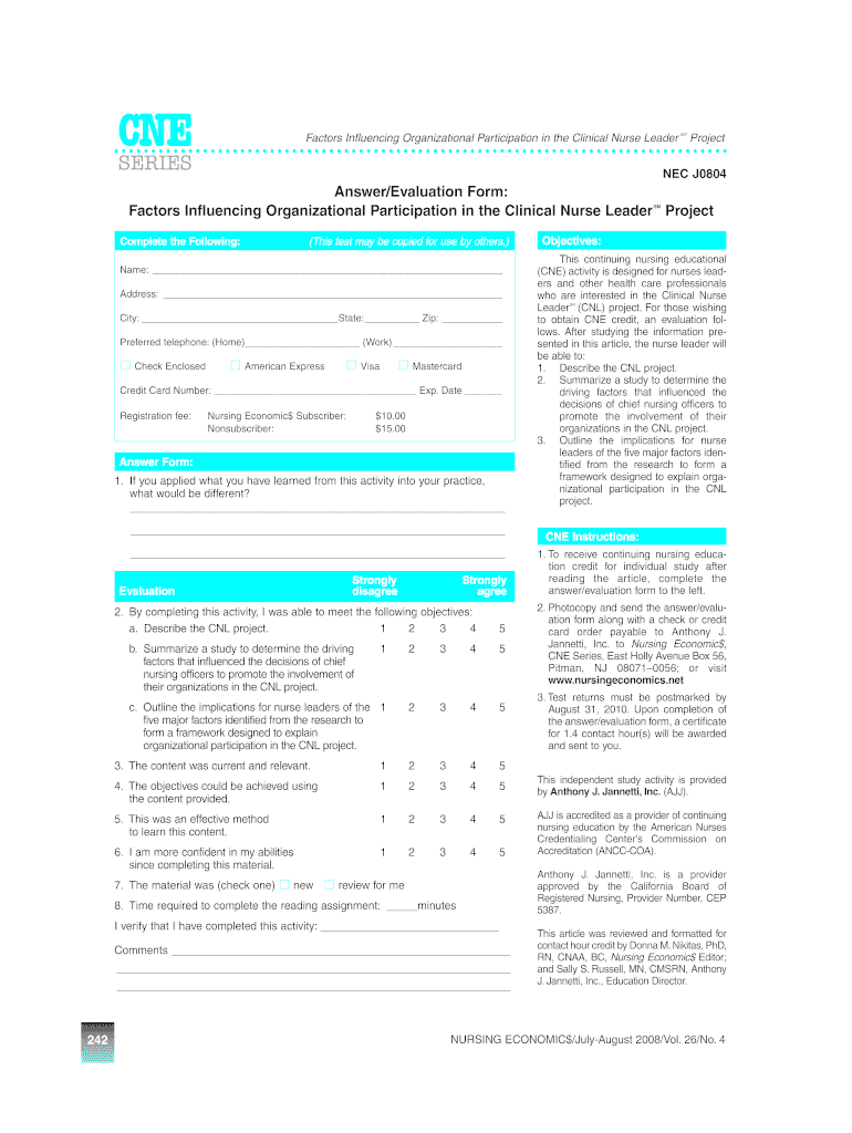 The form is designed for nurses and healthcare professionals, particularly Clinical Nurse Leaders, who need to evaluate their understanding and experience regarding CNL projects and pursue continuing education credit.