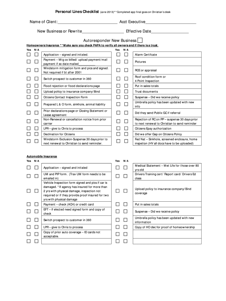 Personal Lines Checklist (June 2013)**Completed app final goes on Christians desk Name of Client: Acct Executive New Business or Rewrite Effective Date Autoresponder New Business Homeowners Insurance