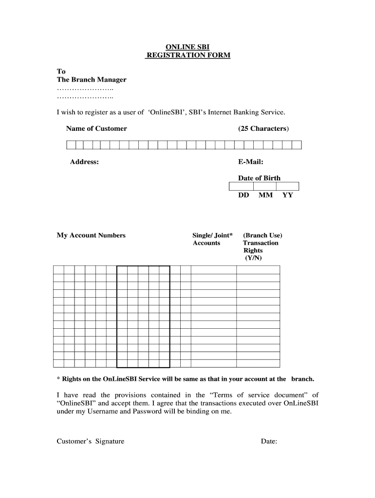 ONLINE SBI REGISTRATION FORM To The Branch Manager. . I wish to register as a user of Online SBI, SBI s Internet Banking Service. Name of Customer (25 Characters) Address: E-Mail: Date of Birth DD