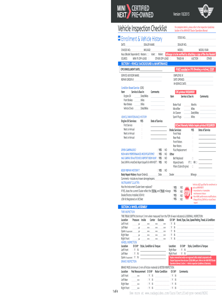 Chassis # Version 10×2013 69 Road Test Vehicle Inspection Checklist STATIONARY REVIEW (cont d.) AREA Electrical Meets MINI Guidelines & Standards Enrollment & Vehicle History Comments: DATE: Vanity×visor