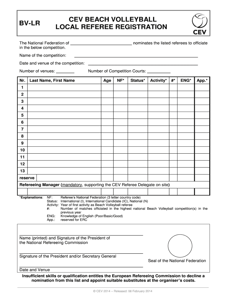 Get the free BV-LR CEV BEACH VOLLEYBALL LOCAL REFEREE REGISTRATION - cevadmin cev