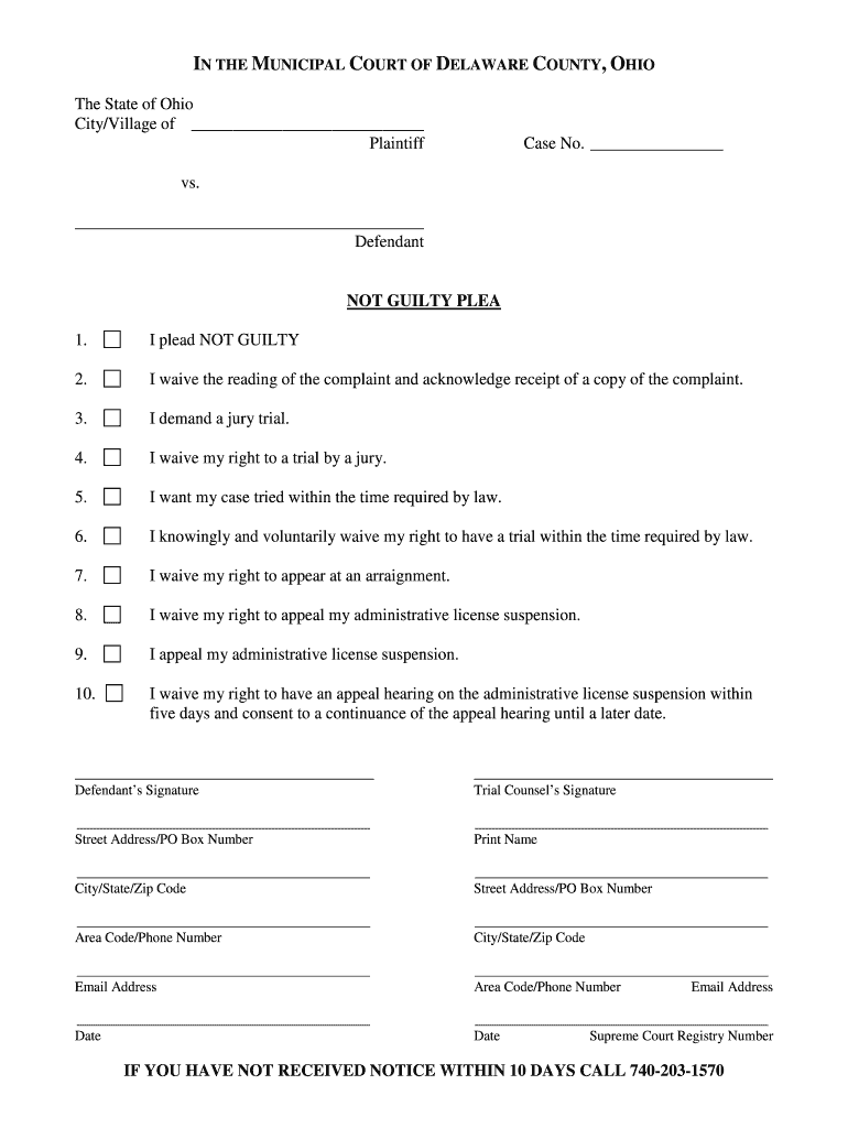 IN THE MUNICIPAL COURT OF DELAWARE COUNTY, OHIO The State of Ohio City×Village of Plaintiff Case No. vs. Defendant NOT GUILTY PLEA 1. I plead NOT GUILTY 2. I waive the reading of the complaint and