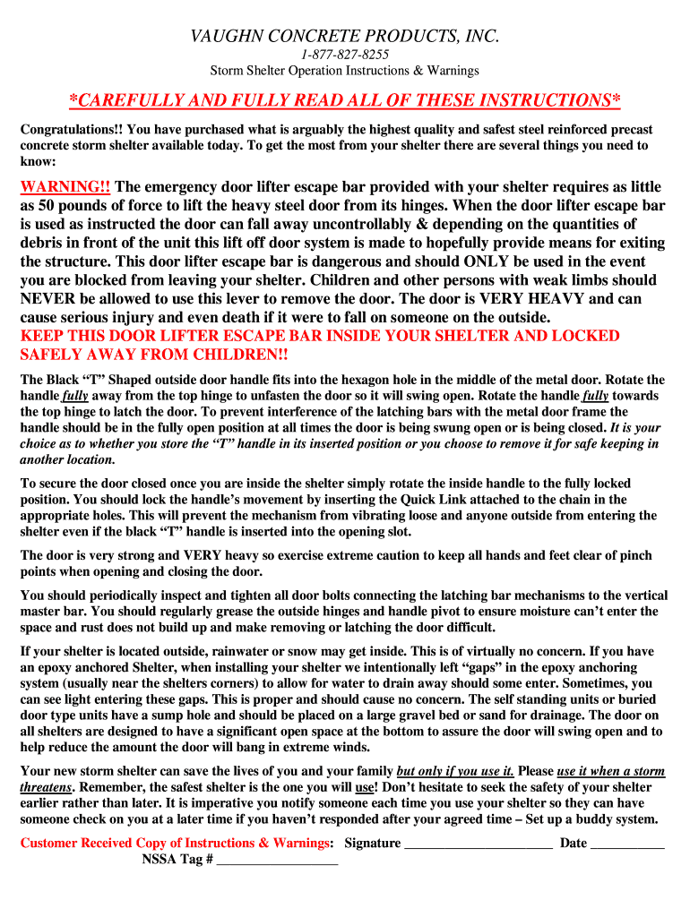 VAUGHN CONCRETE PRODUCTS, INC. 18778278255 Storm Shelter Operation Instructions & Warnings *CAREFULLY AND FULLY READ ALL OF THESE INSTRUCTIONS* Congratulations!! You have purchased what is arguably