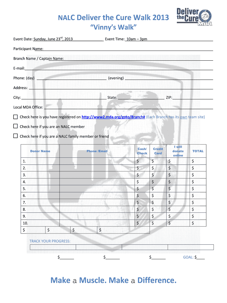 NAC Deliver the Cure Walk 2013 Vinny Walk Event Date: Sunday, June 23rd, 2013 Event Time: 10am 3pm Participant Name: Branch Name / Captain Name: Email: Phone: (day) (evening) Address: City: State: