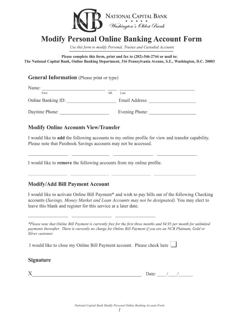 Washington s Oldest Bank Modify Personal Online Banking Account Form Use this form to modify Personal, Trustee and Custodial Accounts Please complete this form, print and fax to (202)-546-2744 or