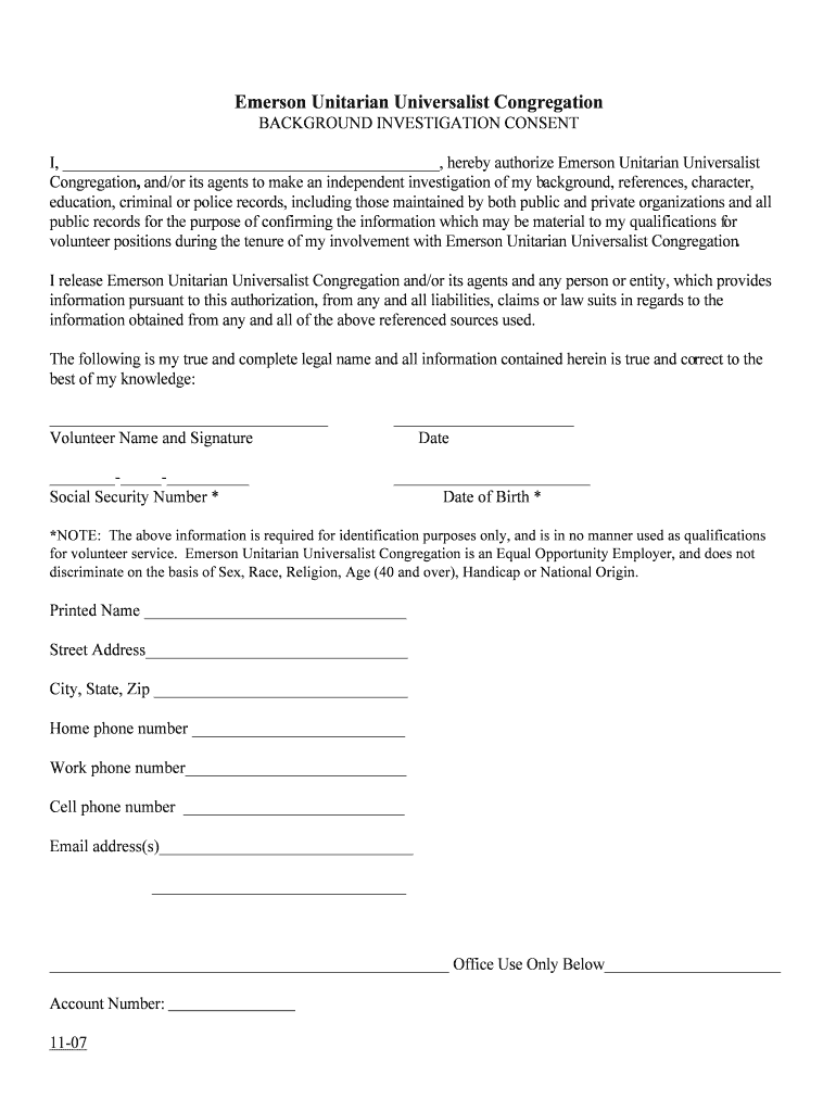Emerson Unitarian Universalist Congregation BACKGROUND INVESTIGATION CONSENT I, hereby authorize Emerson Unitarian Universalist Congregation, and×or its agents to make an independent investigation