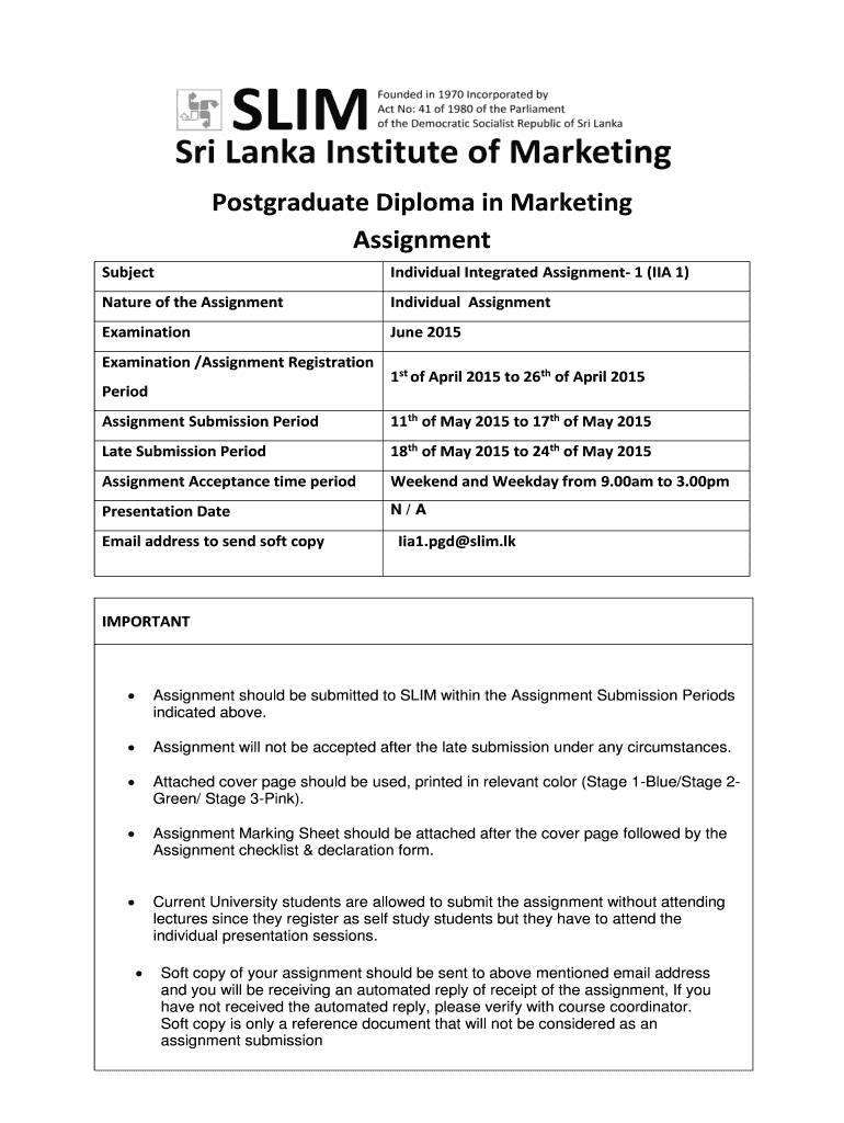 Postgraduate Diploma in Marketing Assignment Subject Individual Integrated Assignment- 1 (IIA 1) Nature of the Assignment Individual Assignment Examination June 2015 Examination /Assignment Registration