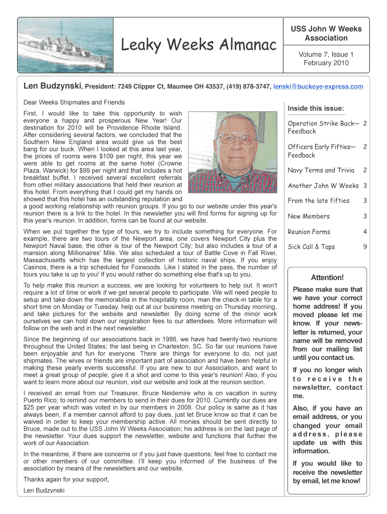 Leaky Weeks Almanac USS John W Weeks Association Volume 7, Issue 1 February 2010 Len Kaczyński, President: 7249 Clipper Ct, Maumee OH 43537, (419× 8783747, lens buckeyeexpress.com Dear Weeks Shipmates