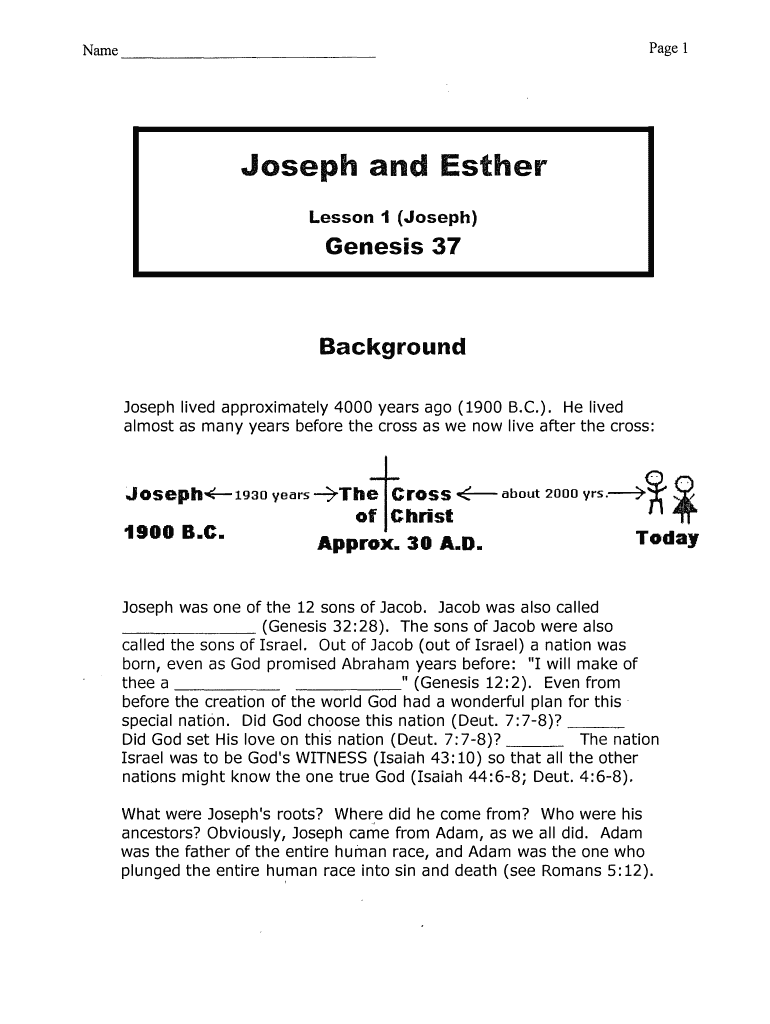 Name Page 1 Joseph and Esther Lesson 1 (Joseph) Genesis 37 Background Joseph lived approximately 4000 years ago (1900 B. C. ×. He lived almost as many years before the cross as we now live after