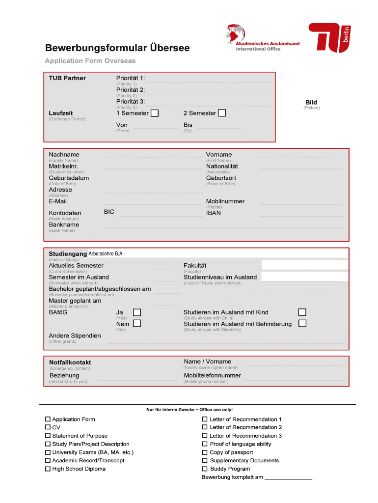 Holen Sie sich kostenlos Bewerbungsformular bersee Application Form Overseas TUB Partner Prioritt...