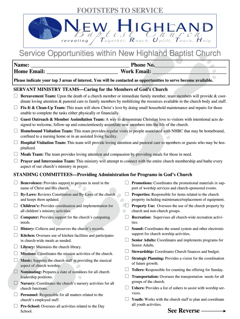 FOOTSTEPS TO SERVICE Opportunities within New Highland Baptist Church Name: Phone No. Home Email: Work Email: Please indicate your top 3 areas of interest. You will be contacted as opportunities to