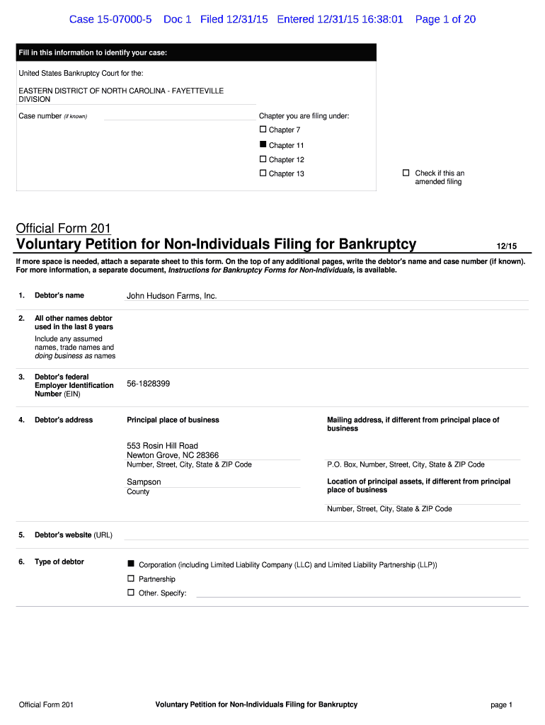 Case 15070005 Doc 1 Filed 12×31/15 Entered 12×31/15 16:38:01-Page 1 of 20 Fill in this information to identify your case: United States Bankruptcy Court for the: EASTERN DISTRICT OF NORTH CAROLINA