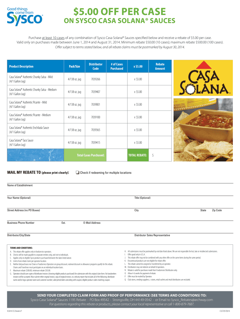 $5.00 off per case on Sysco CASA SOLANO SAUCES Purchase at least 10 cases of any combination of Sysco Casey Solano Sauces specified below and receive a rebate of $5.00 per case. Valid only on purchases