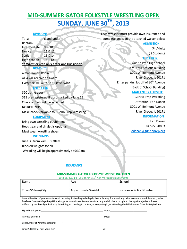 MIDSUMMER GATOR FOLKTALE WRESTLING OPEN SUNDAY, JUNE 30TH, 2013 DIVISIONS Tots: 6 and under Bantam: 7&8 Intermediate: 9 & 10 Novice: 11 & 12 Senior: 13 & 14 High School: 15 18 ** Wrestlers can only