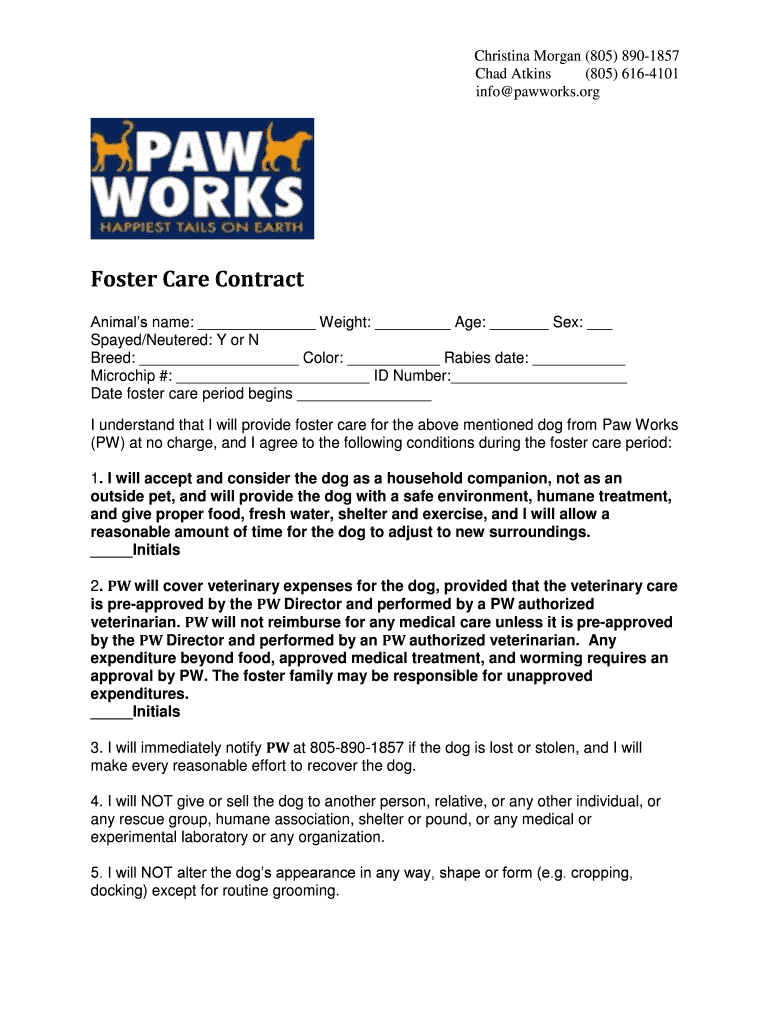 Christina Morgan (805× 8901857 Chad Atkins (805× 6164101 info paw works.org Foster Care Contract Animals name: Weight: Age: Sex: Spayed×Neutered: Y or N Breed: Color: Rabies date: Microchip #: