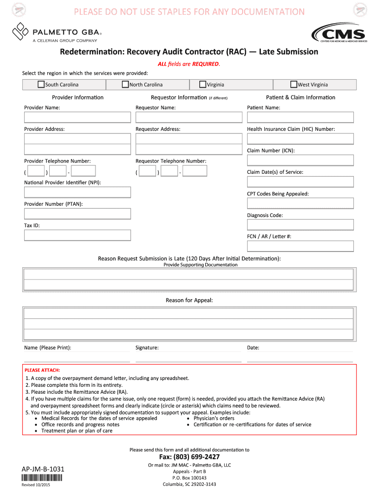 PLEASE DO NOT USE STAPLES FOR ANY DOCUMENTATION Redetermination: Recovery Audit Contractor (RAC) Late Submission ALL ends are REQUIRED. Select the region in which the services were provided: South