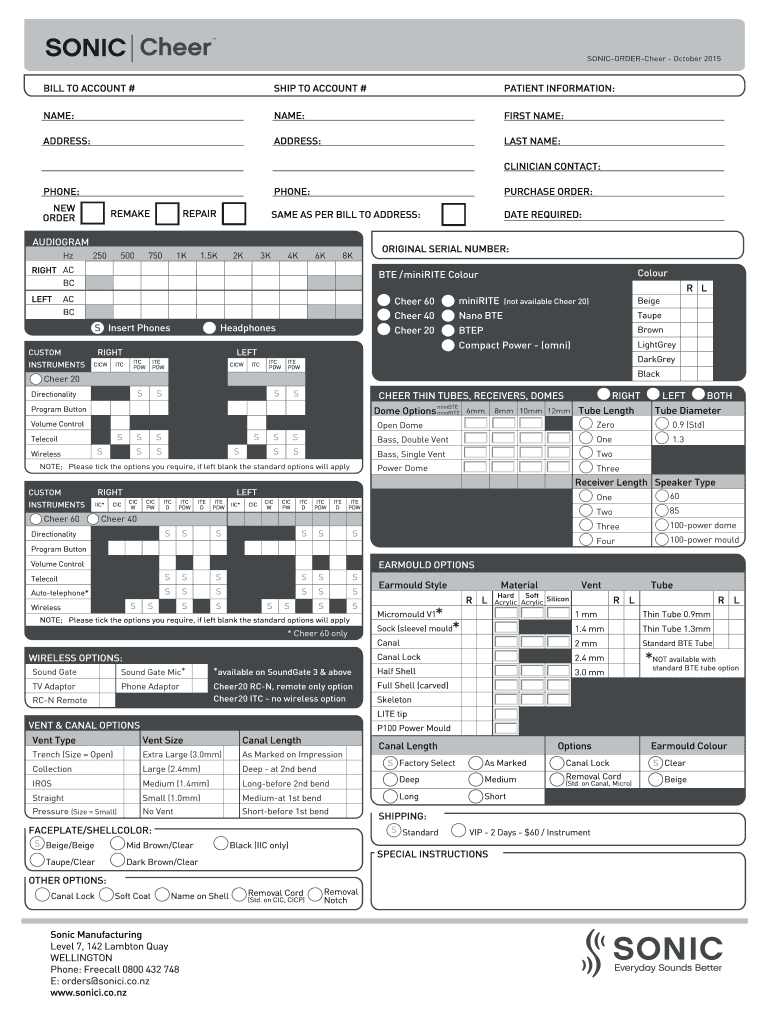 Cheer SONIC-ORDER-Cheer — October 2015 BILL TO ACCOUNT # SHIP TO ACCOUNT # PATIENT INFORMATION: NAME: NAME: FIRST NAME: ADDRESS: ADDRESS: LAST NAME: CLINICIAN CONTACT: PHONE: NEW ORDER REMAKE REPAIR