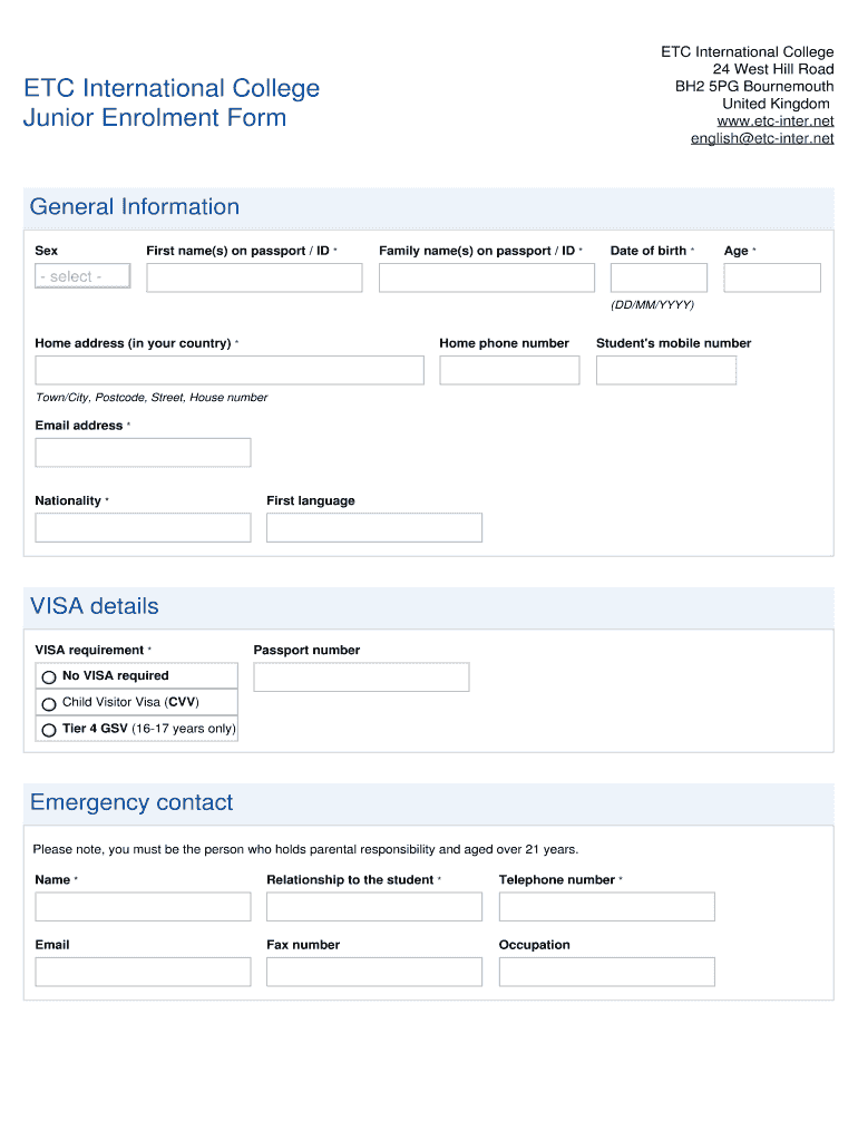 ETC International College 24 West Hill Road BH2 5PG Bournemouth United Kingdom www.etcinter.net English etc inter.net ETC International College Junior Enrollment Form General Information First name’s)